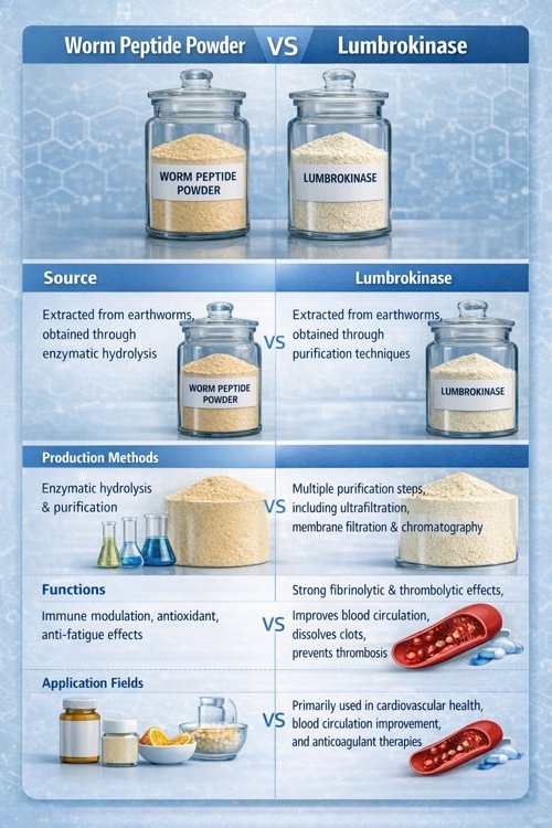 One is a complex mixture of small peptides and nutritional components, often positioned for broader functional-food and nutraceutical use. The other is a specific fibrinolytic enzyme complex, valued for targeted thrombolytic and fibrin-related applications. Put simply: earthworm peptide powder is the wider toolbox; lumbrokinase is the precision tool.