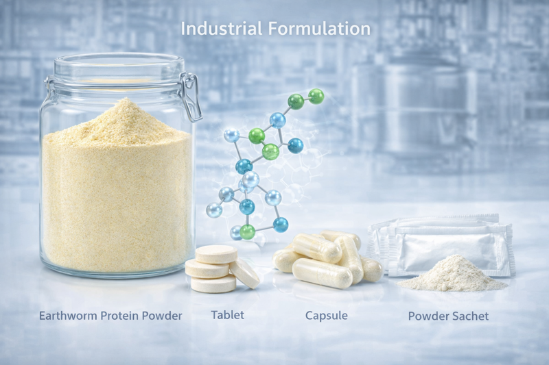 Earthworm protein powder is stable enough for many industrial applications, especially in dry systems such as capsules, tablets, sachets, and powder blends. The uploaded materials support its use as a concentrated protein ingredient and as a starting point for peptide-rich fractions with functional potential. Low-temperature drying, filtration, drying, and powder handling all point to decent manufacturability.