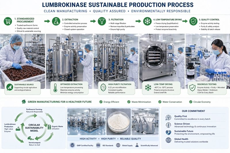Company materials for lumbrokinase already frame the process around raw material selection, enzymatic extraction, centrifugation and filtration, low-temperature drying, sterilization, and packaging, with controlled processing positioned as essential for activity retention and purity. That is not just a quality story. It is a sustainability story too, because activity retention means fewer wasted batches and less overprocessing to compensate for damage.